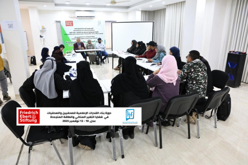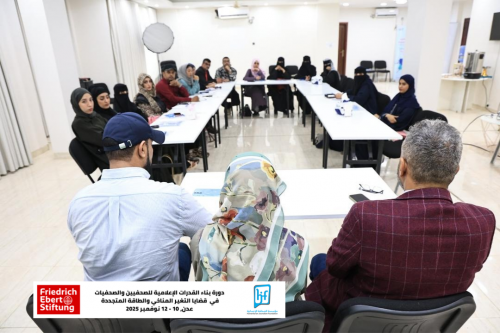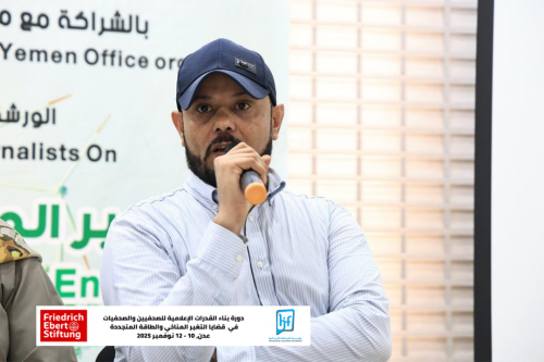 افتتحت مؤسسة الصحافة الإنسانية (hjf) بالشراكة مع مؤسسة فريدريش إيبرت الألمانية (FES) – مكتب اليمن، اليوم الاثنين، 10 نوفمبر 2025 ورشة عمل متخصصة لبناء القدرات الإعلامية حول "التغير المناخي والطاقة المتجددة"، بمشاركة 20 متدرب من الصحفيين والإعلاميين في مدينة عدن.